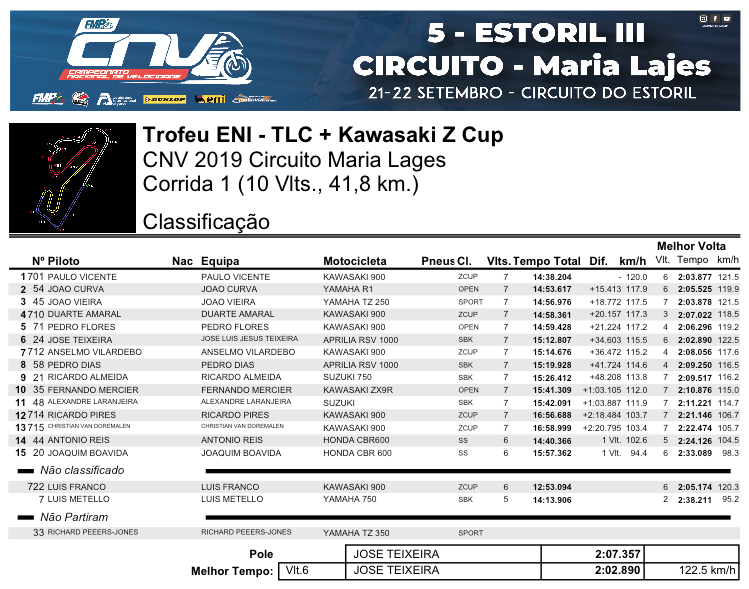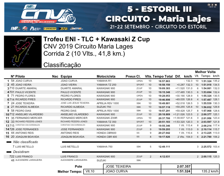 Foi pena, pois não terminou qualificado, mas os azares de uns, são a sorte dos outros, e Franco com esta desistência, deixa Amaral lutar com Vicente pelo titulo e entrega a Vilardebó a oportunidade de conquistar, assim, o seu primeiro e merecido pódio! Este termina em 7º da geral e 3º das Zs, superando o líder das SBK do ENI/TLC (Ricardo Almeida).