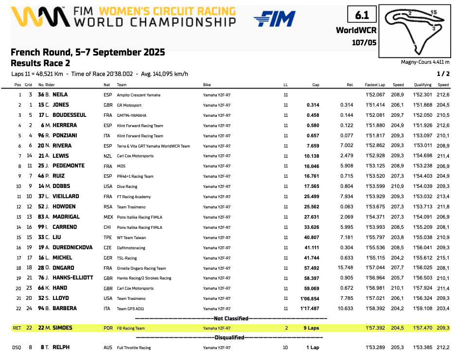 Madalena Simões desta não terminou, desistindo à 10ª volta depois duma queda na curva 13.