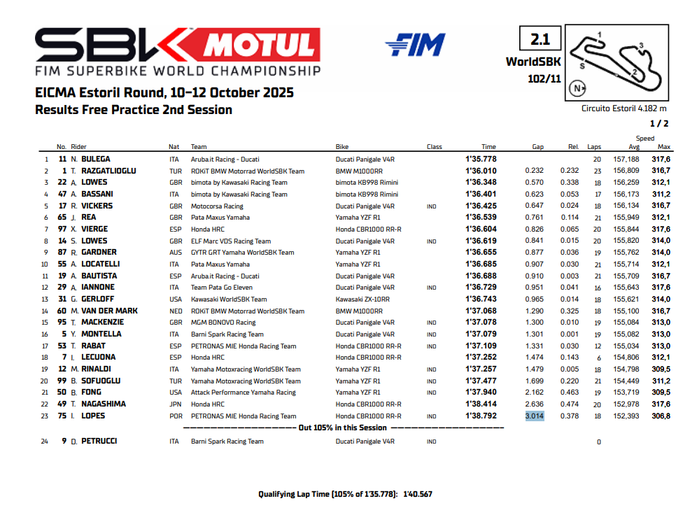 Ivo Lopes terminou o dia na 23ª posição, o piloto português promete lutar pelos pontos, apesar de ter feito um registo de 1’38.792, o melhor tempo pessoal a +3.014 do líder da sessão, Bulega.