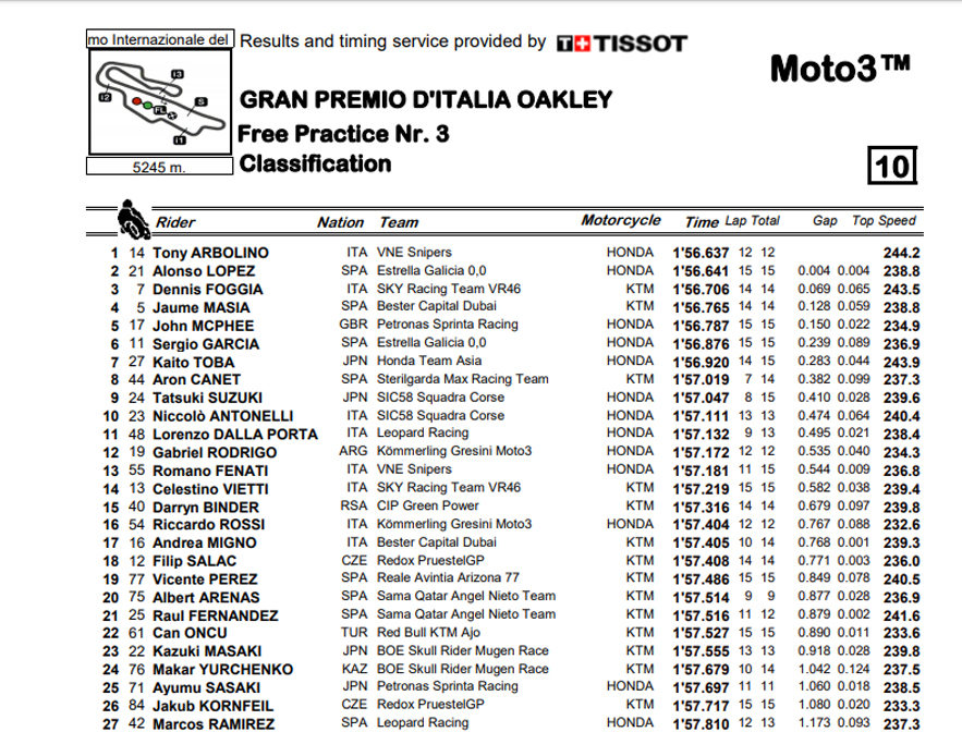 Os primeiros 10 estavam todos no 1:57, e iam até Antonelli, com vantagem para o 1:57.019 de Canet. O piloto da Sterilgarda Max foi mantendo a vantagem enquanto atrás dele Migno e Arbolino apareciam também.